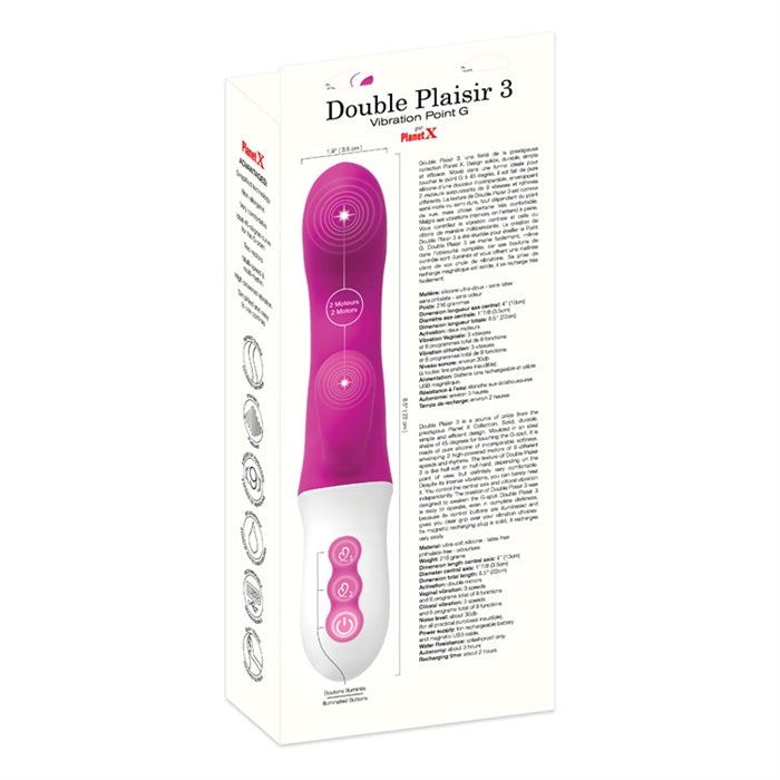 Double Plaisir 3, une fierté de la prestigieuse collection Planet X. Design solide, durable, simple et efficace. Moulé dans une forme idéale pour toucher le point G à 45 degrés, il est fait de pure silicone d’une douceur incomparable, enveloppant 2 moteurs surpuissants de 9 vitesses et rythmes différents. La texture de Double Plaisir 3 est comme semi-molle ou semi-dure, tout dépendant du point de vue, mais chose certaine très confortable. Malgré ses vibrations intenses, on l’entend à peine. Vous contrôlez la vibration centrale et celle du clitoris de manière indépendante. La création de Double Plaisir 3 a été étudiée pour éveiller le Point G. Double Plaisir 3 se manie facilement, même dans l’obscurité complète, car ses boutons de contrôle sont illuminés et vous offrent une maîtrise claire de vos choix de vibrations. Sa prise de recharge magnétique est solide, il se recharge très facilement.