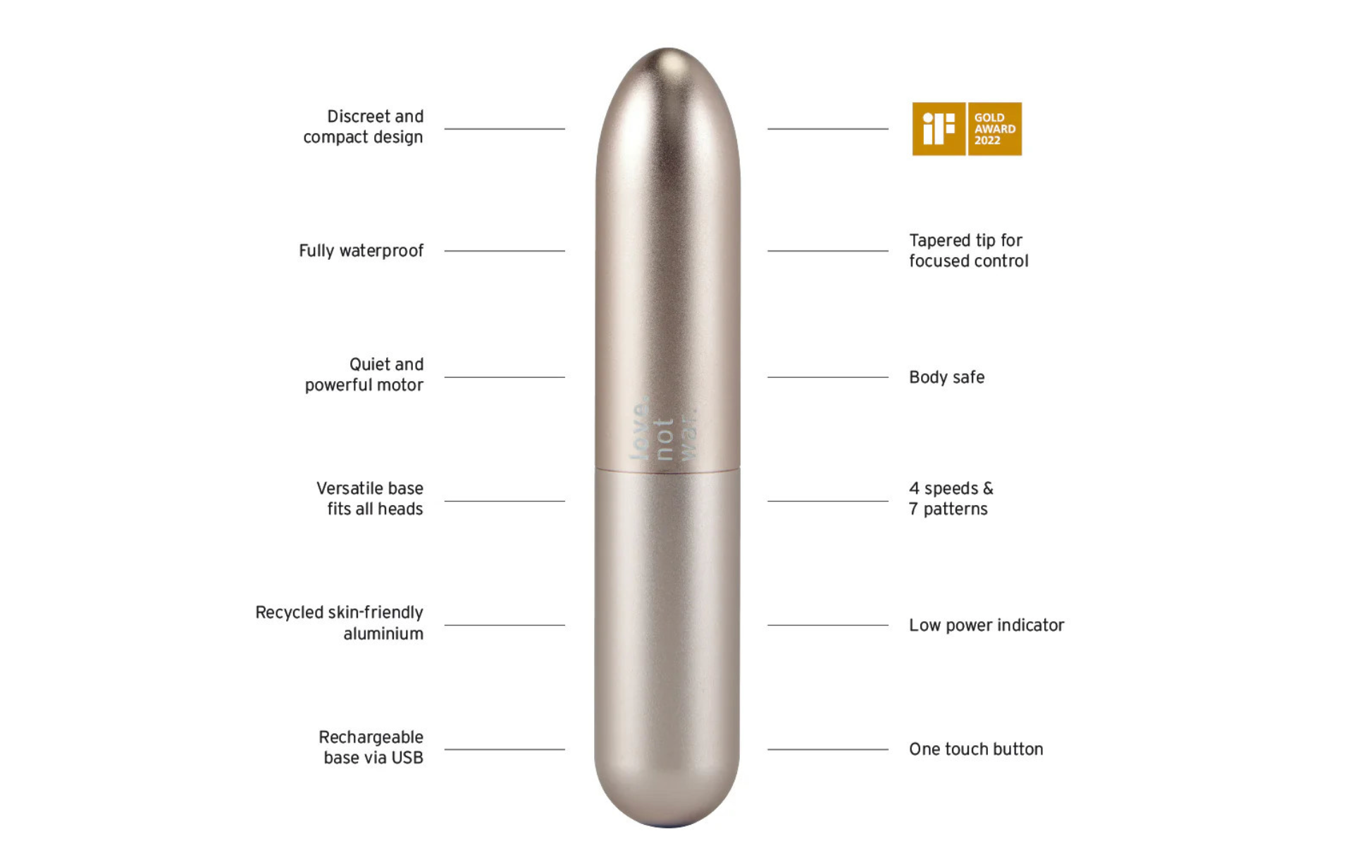 Ce beau bullet au design discret de LOVE NOT WAR est intensément puissant, avec sa surface métallique délivrant des vagues de plaisir satisfaisantes directement sur vos zones érogènes. La pointe effilée vous offre un contrôle précis et l'aluminium peut être refroidi ou réchauffé en fonction de votre envie.