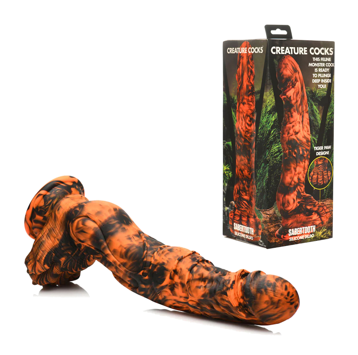 Laissez vos fantasmes s'envoler et votre côté primal prendre le dessus avec ce dildo Sabretooth Creature Cocks ! Ce coq camo orange et noir a des rainures, des crêtes, des nervures et des lignes que nous garantissons que votre corps n'a jamais connu auparavant ! La tête charnue et la tige épaisse et incurvée rencontrent les boules griffues en forme de patte à la base.